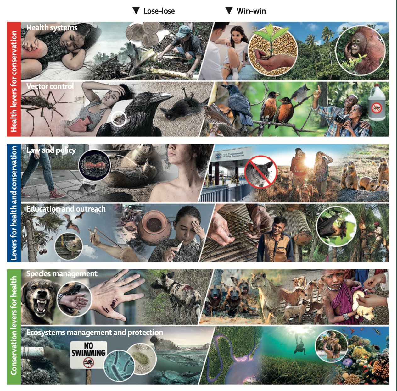 August 4, 2022. After years of data synthesis, the Ecological Levers for Health Working Group published their systematic literature review of 46 potential win-win solutions for reducing human infectious disease burdens and advancing conservation goals. “The proposed solutions addressed diverse conservation threats and human infectious diseases, and thus, the proposed interventions varied in scale, costs, and impacts. Some potential solutions had medium-quality to high-quality evidence for previous success in achieving proposed impacts in one or both sectors. However, there were notable evidence gaps within and among solutions, highlighting opportunities for further research and adaptive implementation. Stakeholders seeking win–win interventions can explore this Review and an online database to find and tailor a relevant solution or brainstorm new solutions.” You can read the new open access paper in Lancet Planetary Health or search through the 46 proposed solutions on this website.